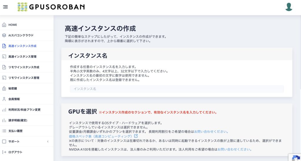 GPUSOROBANのWebサイトへログインし、サイドバー「高速インスタンス作成」メニューを選択します。