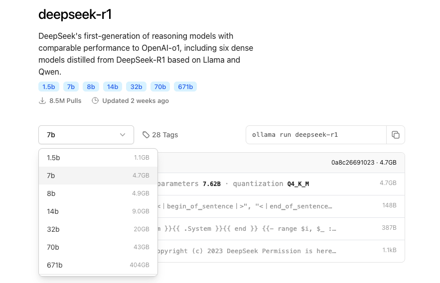 Ollamaの公式モデル一覧からDeepSeek R1のDistilled Modelsを選択しダウンロードコマンドを実行します。