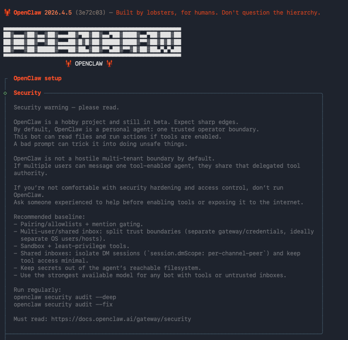 インストール完了後、そのままオンボーディング(初期設定)が始まります。基本的にはプロンプトの質問に答えていくだけで完了します。