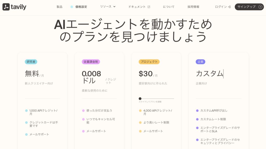 Tavilyはアカウント登録だけで月1,000回まで無料で利用でき、クレジットカードの登録も不要です。
