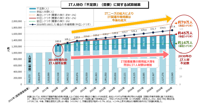 また、ITエンジニアに限定した予測も経済産業省から発表されており、その分析レポートでは2030年に最大で79万人のIT人材が不足すると予想されています。